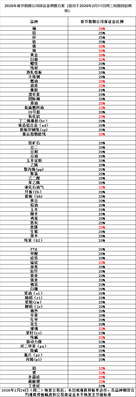 尊敬的客户:国内期货交易所2月14日(周六)至2月23日(周一)春节假期休市,2月13日(周五)当晚无夜盘,2月24日(周二)恢复日夜盘交易。我司将于2月11日(周三)结算时起提高公司保证金比例,详情请登录公司官网查询。请及时调整好仓位,保证资金充足!东亚期货全体员工预祝您新春快乐!