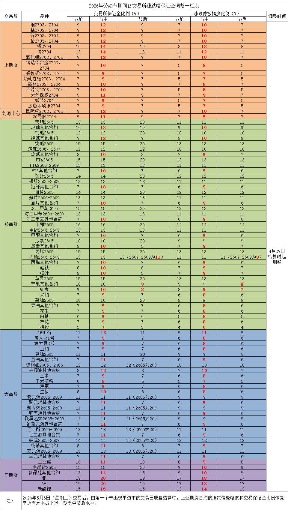 2026年劳动节假期交易所保证金调整一览表