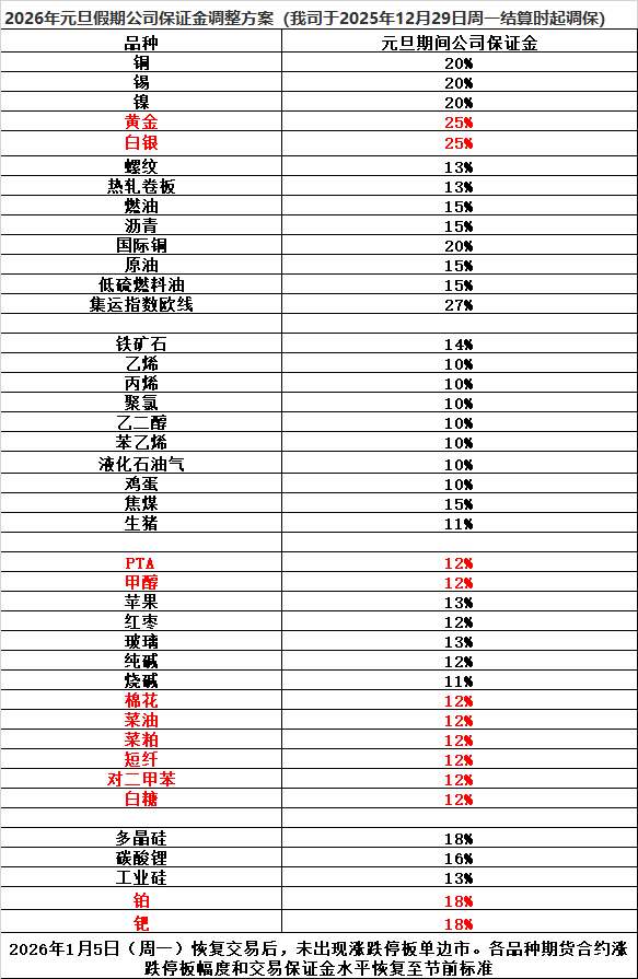 尊敬的客户:国内期货交易所2026年1月1日(周四)至1月4日(周日)元旦休市,12月31日(周三)当晚无夜盘,1月5日(周一)恢复日夜盘交易。我司将于12月29日(周一)结算时起提高公司保证金比例,详情请登录公司官网查询。请及时调整好仓位,保证资金充足!东亚期货全体员工预祝您元旦快乐!